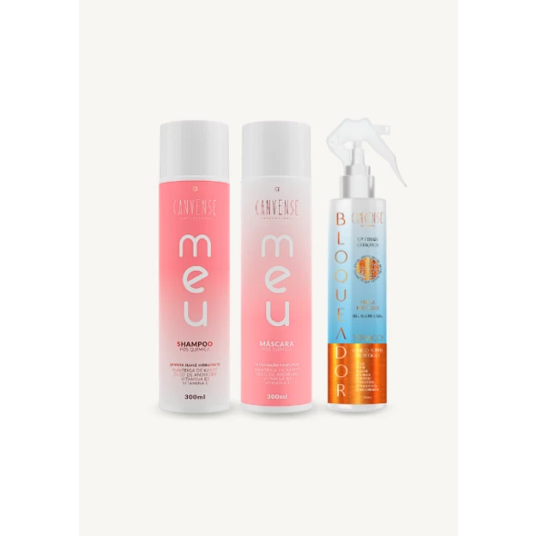 Além do Kit "MEU", eleve seus cuidados capilares com o Bloqueador Térmico Canvense Pro Company. Este produto avançado forma um escudo protetor contra danos diários causados pelo sol, mar, piscina e calor excessivo. Com um poderoso protetor solar e propriedades emulsionantes, o Bloqueador não apenas protege, mas também fortalece os cabelos danificados, proporcionando brilho, maciez e resistência.